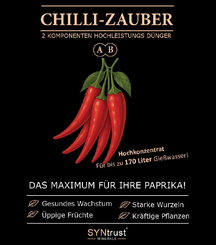Mit diesem 2K-Dünger holen Sie das Maximum aus Ihren Chilli heraus. Erleben Sie eine beeindruckende Fülle an gesunden, leuchtend roten Früchten. Der Dünger stellt sicher, dass Ihre Pflanzen von der Blüte bis zur Ernte optimal versorgt sind.