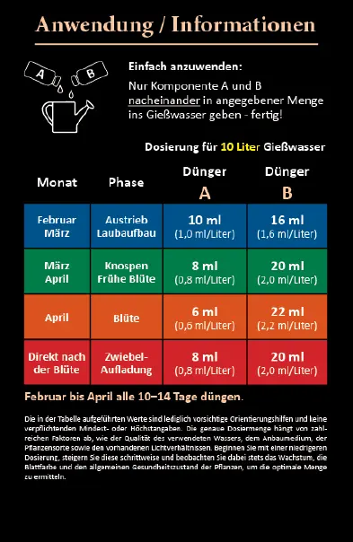 Die getrennte Bereitstellung verhindert Nährstoffverluste durch chemische Reaktionen. So erhalten Ihre Pflanzen jederzeit die volle Kraft von Stickstoff, Phosphor, Kalium, Calcium, Magnesium und wertvollen Spurenelementen. Das bedeutet: kräftiger Austrieb, sattes Blattgrün, stabile Stiele und eine eindrucksvolle Blüte. Nach der Blüte unterstützt die ausgewogene Nährstoffversorgung das Einlagern von Reserven in die Zwiebel.