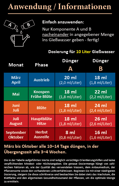 Die getrennte Bereitstellung verhindert Nährstoffverluste durch chemische Reaktionen. So können wir hochwertigere, optimal verträgliche Rohstoffe einsetzen. Dadurch erhalten Ihre Pflanzen jederzeit die volle Kraft von Stickstoff, Phosphor, Kalium, Calcium, Magnesium und wertvollen Spurenelementen. Das bedeutet: vitaler Austrieb, gesunde Blätter, sicherer Fruchtansatz und aromatische, gleichmäßig ausgereifte Früchte.